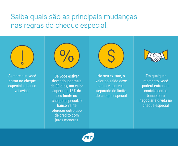A partir deste domingo (1º), entram em vigor as novas regras para uso cheque especial. As medidas, elaboradas pelo conselho de autorregulação da Federação Brasileira de Bancos (Febraban), determinam a oferta de alternativas para o pagamento do saldo devedor com juros menores e condições mais vantajosas, além de ampliar a transparência e o detalhamento de informações sobre o uso desse tipo de crédito. O cheque especial é uma modalidade de crédito rotativo, vinculada diretamente à conta-corrente do usuário, sem necessidade de garantia.>
