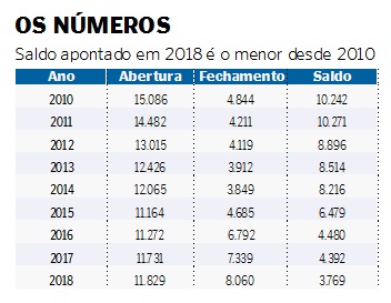 O maior saldo foi registrado em 2011, quando o país vivia outra realidade econômica. Naquele ano, foram 14.482 empresas abertas, 4.211 fechadas e um saldo de 10.271.>