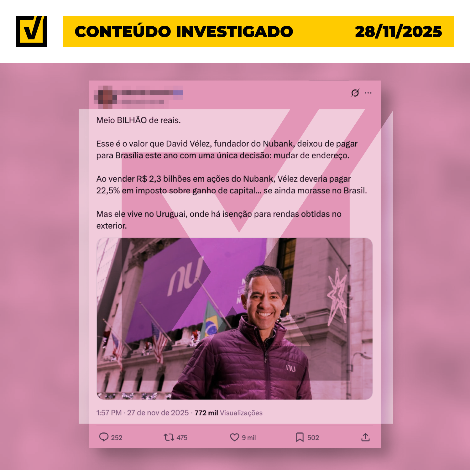 A venda de ações do Nubank por parte de David Vélez, um dos fundadores da empresa, tem gerado desinformação nas redes sociais. A maioria dos posts alega que o empresário teria economizado R$ 500 milhões em impostos no Brasil ao se mudar para o Uruguai, o que não é inteiramente verdadeiro. >
