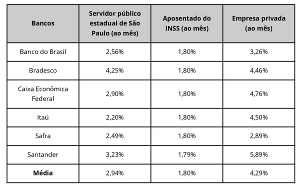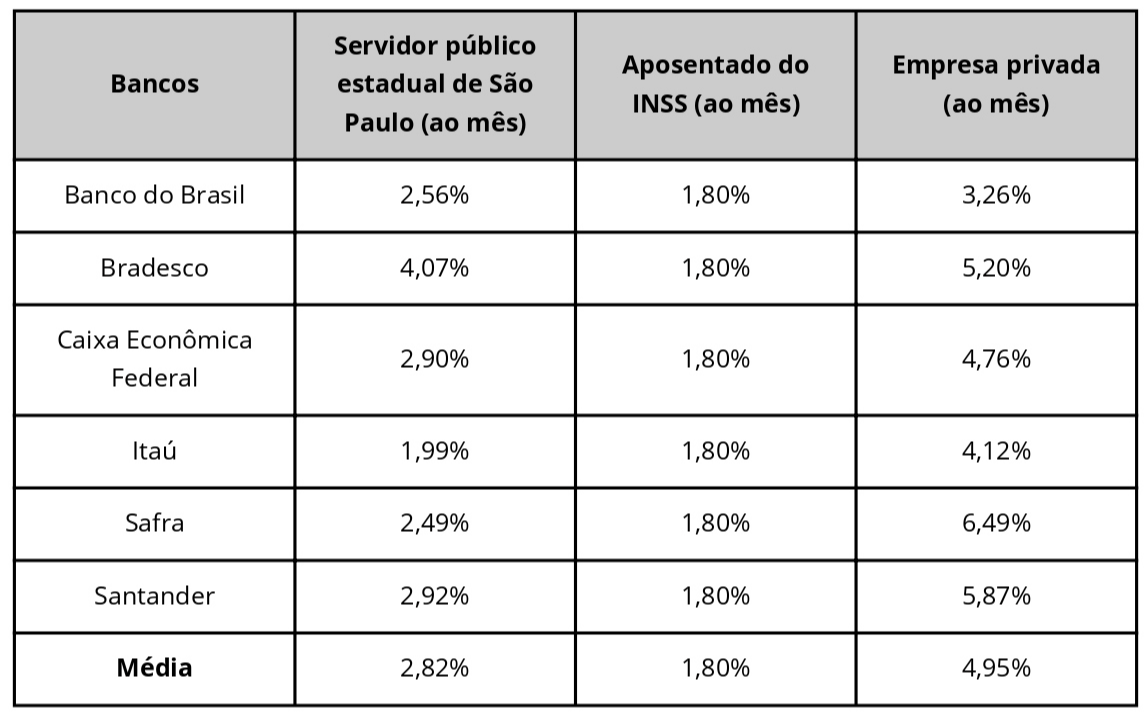 Entre os bancos, o Bradesco teve as maiores taxas máximas para servidores públicos. Em nota, a instituição diz que a taxa apontada pela pesquisa não reflete a média da maior parte dos contratos firmados nesta linha, que tem taxas a partir de 1,30% ao mês.>
