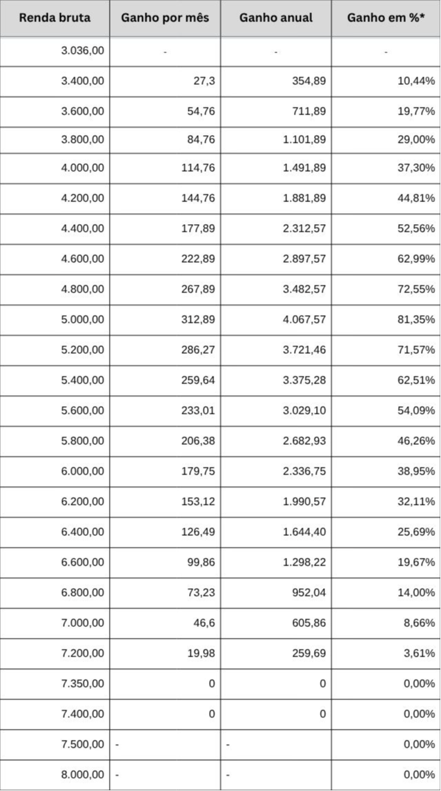 Veja tabela completa que mostra a diferença no salário dos trabalhadores por mês e no ano, incluindo o 13º, feita pela Confirp.>