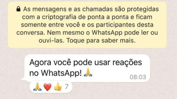 "Estamos felizes em anunciar que agora é possível usar as reações com emojis baixando a última versão do app. As reações são divertidas, rápidas e ajudam a reduzir o excesso de mensagens nos grupos. Vamos seguir melhorando esse recurso, adicionando cada vez mais expressões daqui para frente", disse a empresa em nota.>