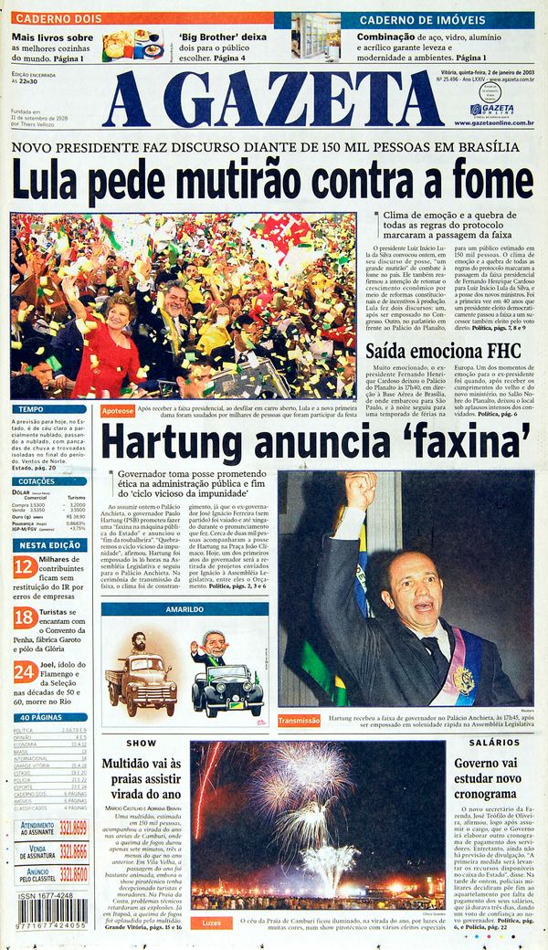 Aquela quarta-feira de verão amanheceu diferente, com um sol tipo vermelho-sangue. Afinal, naquele dia, a esperança venceu o medo. Era 1º de janeiro de 2003 e um arretado metalúrgico pernambucano fazia história ao assumir a Presidência da República, quebrando o monopólio de poder que sempre esteve nas mãos das elites.>