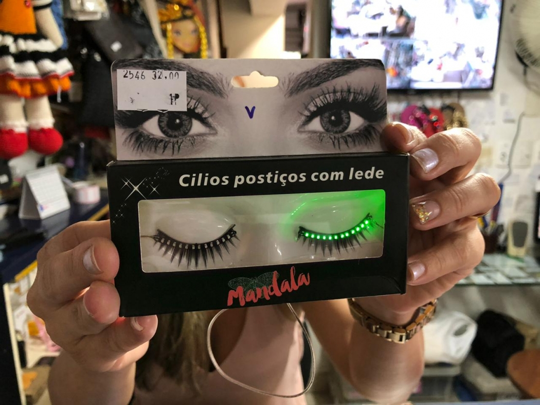 De acordo com ele, os cílios de led estão tendo uma procura grande, bem como as pedrarias. As pestanas, por lá, podem ser adquiridas a partir de R$ 30, dependendo da cor e do tamanho. "No caso das de led, o aparelho já vem com uma bateria acoplada, que é encaixada na orelha, geralmente", explica. Esses adereços podem dar o acabamento necessário para tornar um visual diferente. "Todo ano as pessoas buscam algo novo. Um acessório assim pode ser uma boa pedida", completa.>