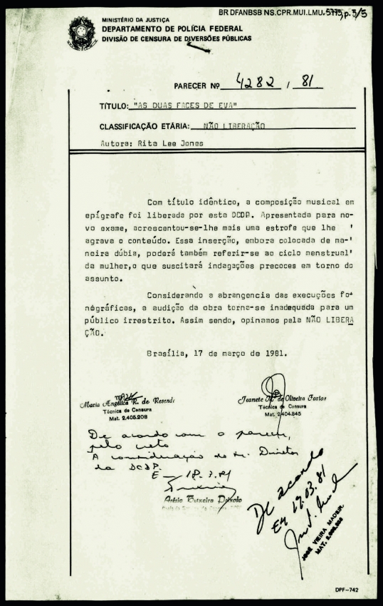 "(...) fiz um corte à la Beatles para apressar o processo, mas cada vez mais ficava com a cara do Ray Conniff", escreve Rita, com sua escrita sempre divertida. Mas o crème de la crème do livro fica por conta do Dossiê Rita Perigosa, que mostra com auxílio de documentos que letras de músicas de sua autoria tiveram de ser modificadas para serem liberadas pelos censores durante a ditadura. Entre elas, sucessos como Banho de Espuma, de 1981, que, originalmente, se chamava Afrodite. Em entrevista ao jornal O Estado de S. Paulo, por e-mail, Rita Lee falou sobre sua fase da 'proibidona'.>