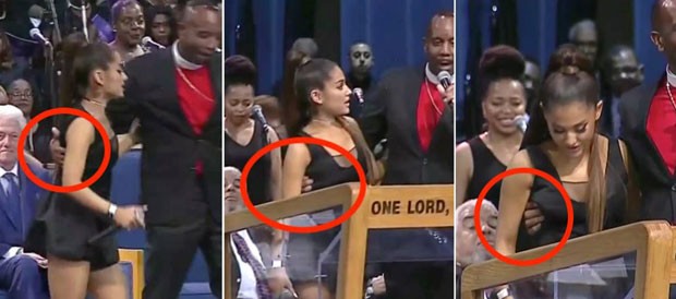 Ariana cantou Natural Woman e depois foi para a frente do caixão, onde o pastor Charles Ellis III comentou sua apresentação. O pastor logo segura na cintura de Ariana, que fica visivelmente desconfortável. Rapidamente, ele vai subindo a mão até a lateral dos seios da cantora e os apalpa.>