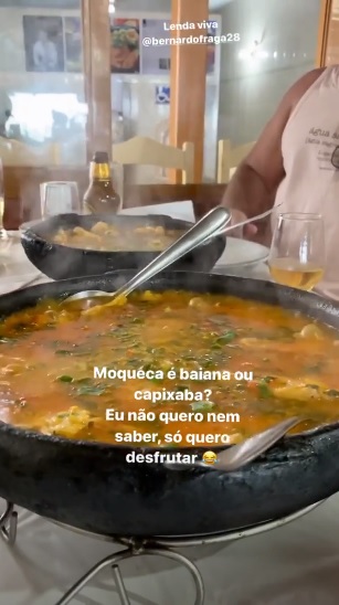 Em seus stories do Instagram, o craque postou que foi a um tradicional restaurante de Meaípe, em Guarapari, para comer moqueca nesta segunda-feira (6) e ainda brincou: "Moqueca é baiana ou capixaba? Eu não quero nem saber, só quero desfrutar". >