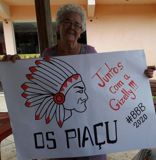 A mãe de Márcia, a avó materna de Gizelly, também acompanhou todos os passos da capixaba no "BBB 20" e, direto de Piaçu, distrito de Muniz Freire, celebrou a aparição da advogada na televisão com um cartaz dizendo: "Os Piaçu juntos com a Gizelly!". >