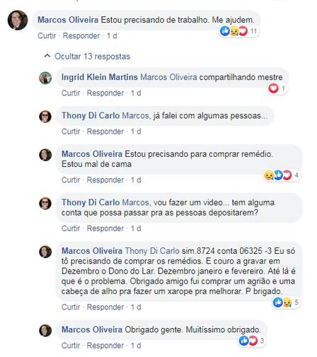 Ele fez um apelo nas redes sociais pedindo por emprego para comprar remédios. "Estou precisando de trabalho. Me ajudem. Eu só estou precisando comprar remédios, estou mal de cama", escreveu o ator no Facebook.>
