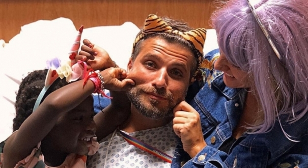 Em seu Instagram, ela publicou imagens ao lado do marido e da filha do casal, Titi, cinco anos. Os três usam adereços de Carnaval. Giovanna está com uma peruca roxa, e Titi com uma tiara de unicórnio. Mesmo sentado na cama e usando a camisola do hospital, Gagliasso aparece com uma tiara de tigre. Em uma das fotos, mulher e filha puxam as bochechas do ator para "ajudá-lo" a dar uma risada.>