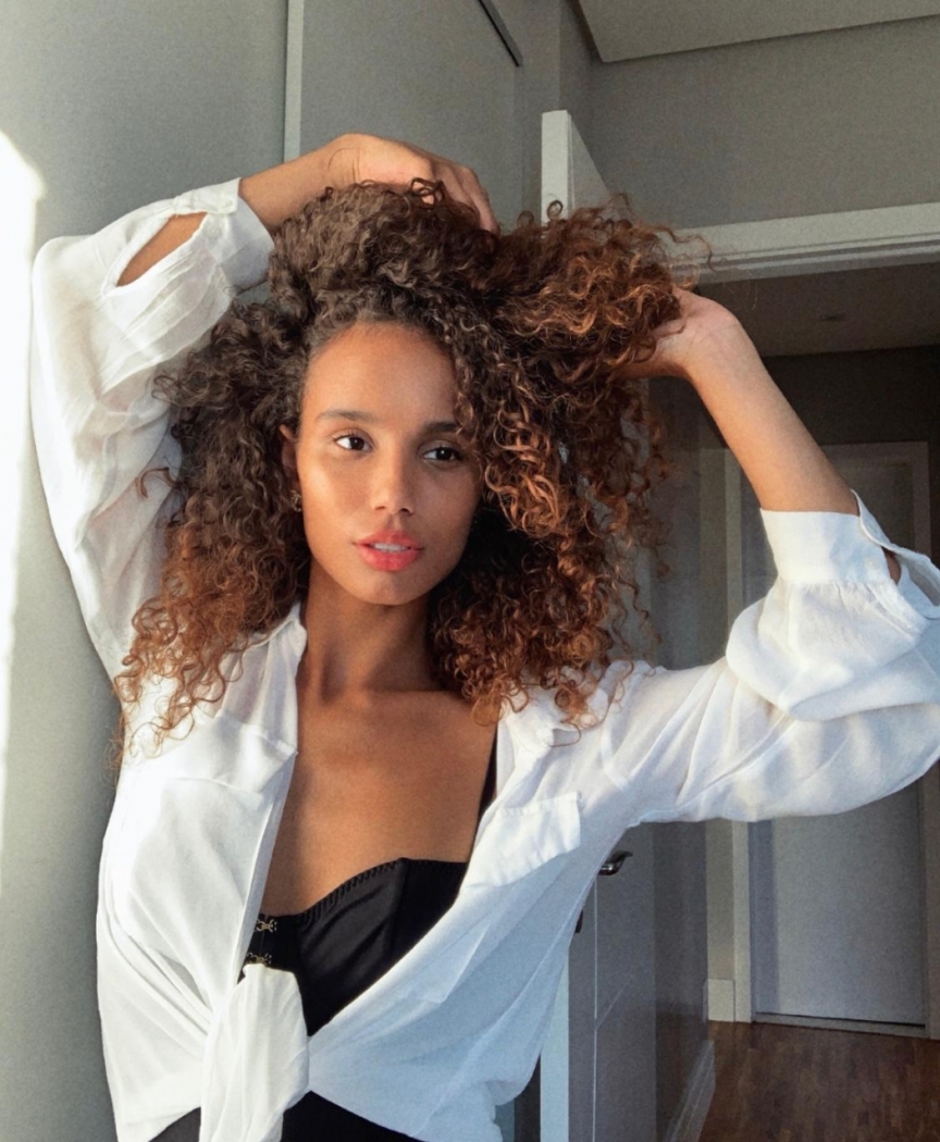 - Textura aos cachos: "Com bigudinho, bobes, flexi rods ou com os acessórios feitos em casa, você pode usar a sua noite de sono para estilizar uma nova curvatura nos cabelos", diz, indicando que às vezes dorme com os itens para modelar as madeixas.>