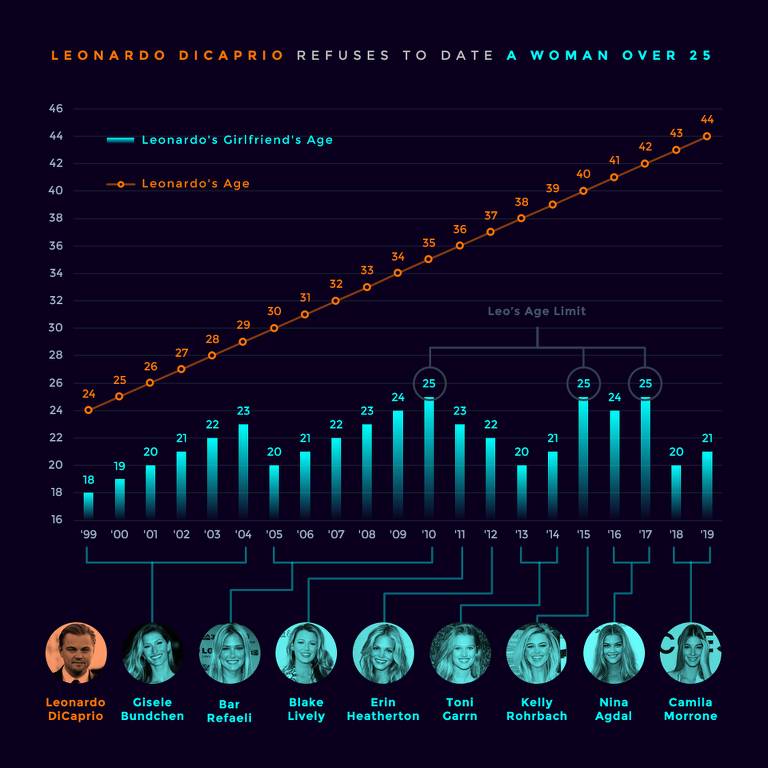 Um usuário da plataforma social Reddit, que reúne grupos de discussão sobre diversos assuntos, fez um gráfico com namoradas conhecidas do ator e constatou que mesmo relacionamento longos, como o que ele teve com a brasileira Gisele Bundchen, 38, e a israelense Bar Refaeli, 33, acabaram quando elas tinham 23 e 25, respectivamente. >