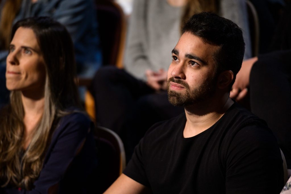 Milton chora e Augusto, do meu lado, segura as lágrimas. Pedro Bial pergunta ao filho de Milton se ele "herdou" algo do pai. "Tô aprendendo a ouvir mais e falar menos", brinca.>