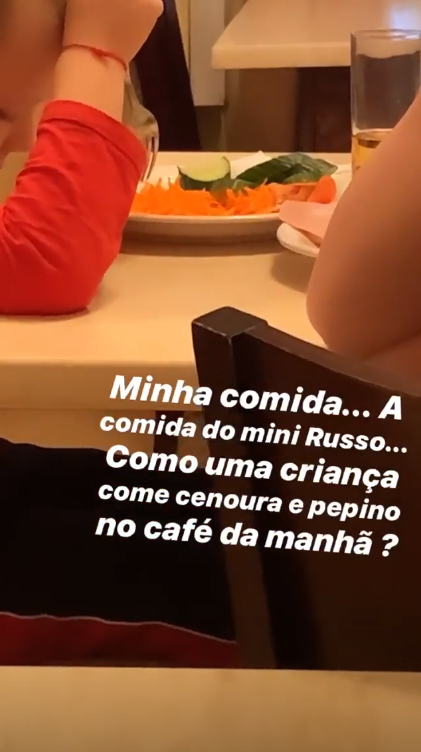 "Como uma criança come cenoura e pepino no café da manhã?", questionou a modelo, nos stories, espantada com a cena. No mesmo vídeo, ela ainda mostrou o seu prato de desjejum e o comparou com o do "mini russo", como se referiu à criança. >