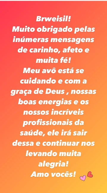 "Meu avô está se cuidando e com a graça de Deus, nossas energias e os nossos incríveis profissionais da saúde, ele vai sair dessa e continuar nos levando muita alegria", afirmou Abravanel em seu perfil no Instagram. >