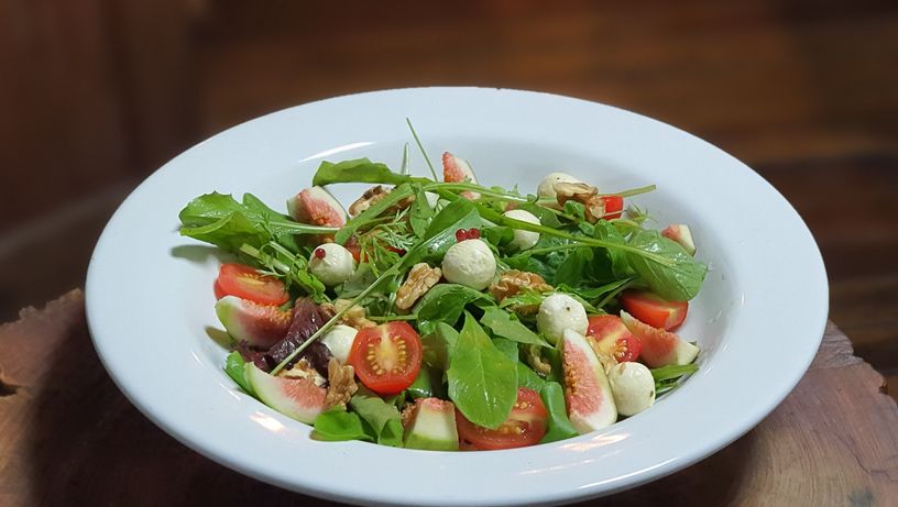 Na salada do bistrô e bar de vinhos Wine Garden, há dois protagonistas: o queijo de cabra, com sua cremosidade e sabor característico delicioso, e o figo fresco, elegante e cheio de personalidade. Completam a mistura folhas baby hidropônicas, tomatinhos cereja fatiados, nozes, pimenta rosa e molho à base de vinagre balsâmico e mostarda de Dijon (R$ 49). Uma boa harmonização possível é o vinho branco chileno Siegel Sauvignon Blanc (R$ 98 a garrafa de 750ml). A casa abre para jantar de segunda a sábado, das 18h à 0h. Rua Joaquim Lírio, 240, loja 3, Praia do Canto, Vitória. (27) 99986-6041. FOTO: Silvestre Tavares