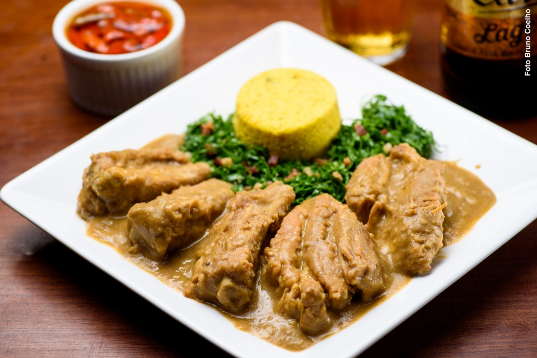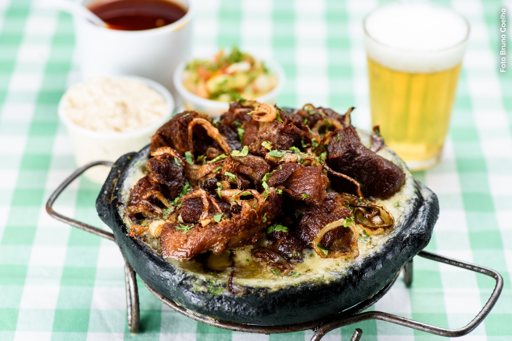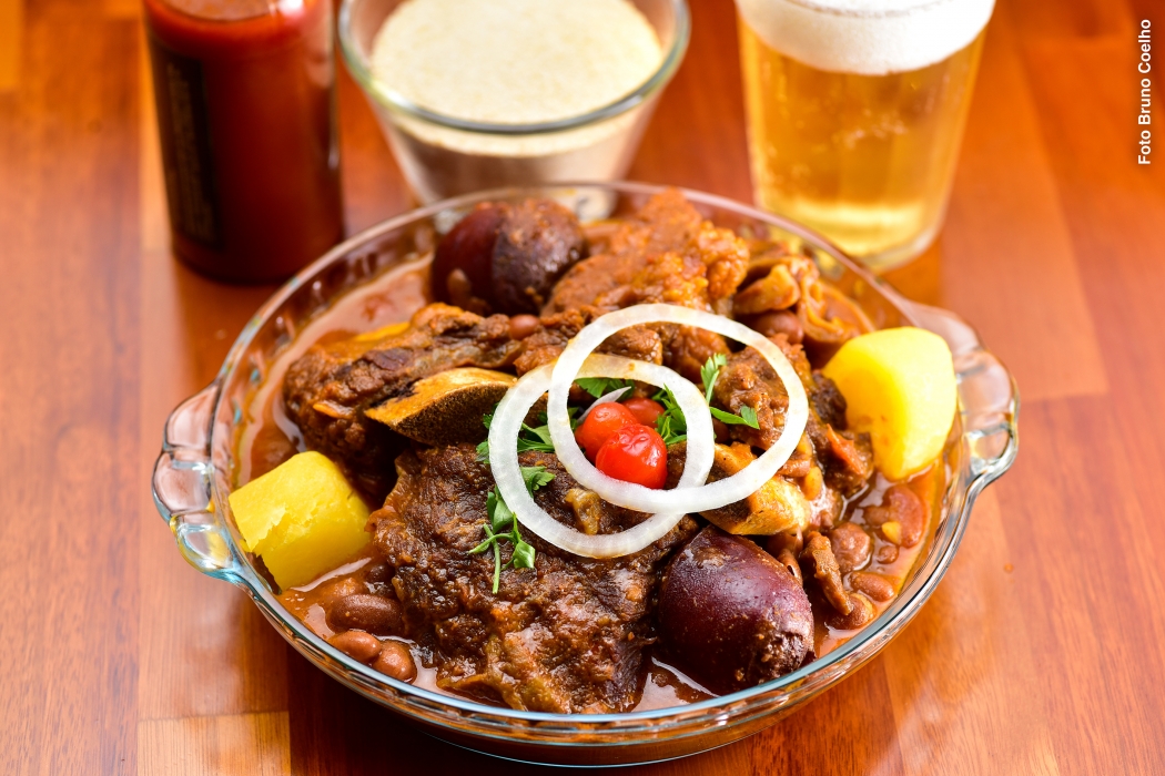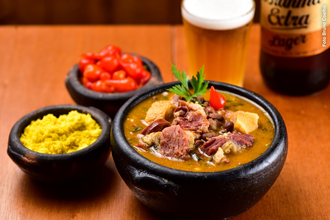 Petisco: Costela do feijão: costela de boi e paio no feijão carioca, batata baroa, pimenta de bico, salsa e cebola.>