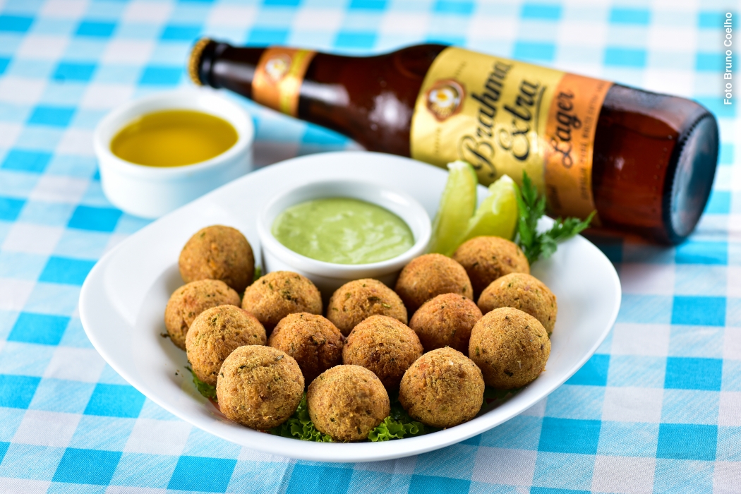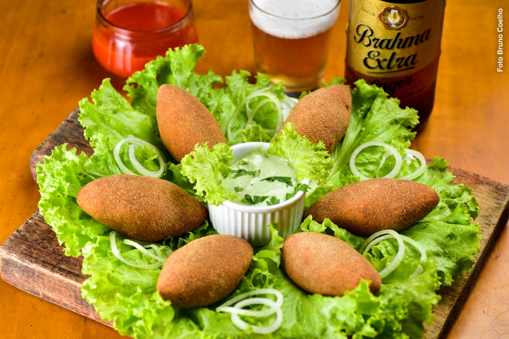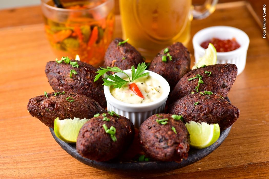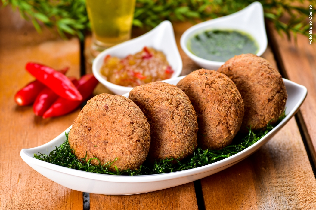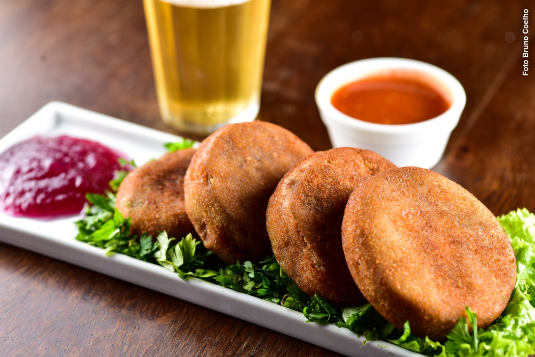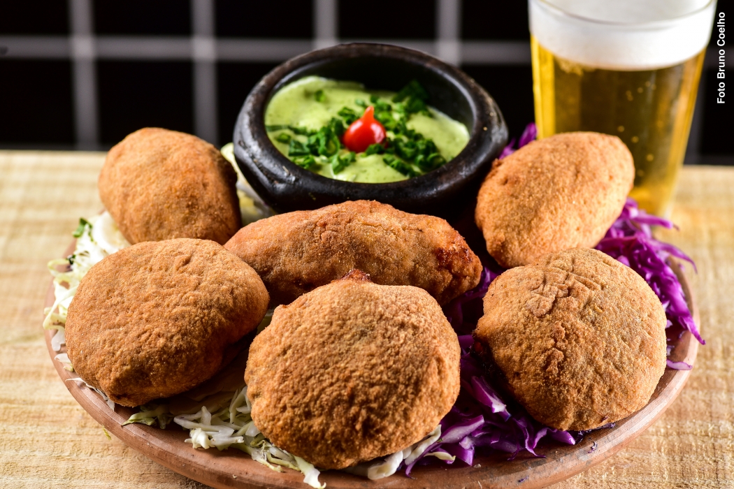 Petisco: Fagiolo carioca: bolinho de feijão branco com carnes defumadas e secas, recheado com bacalhau.>