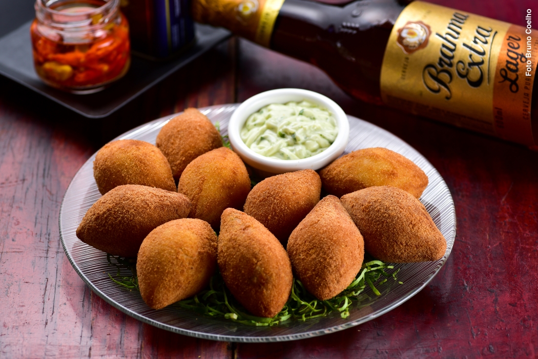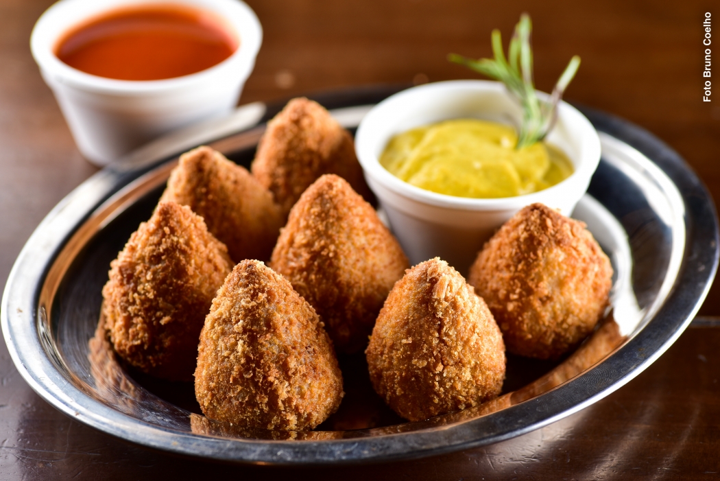 Petisco: Coxinha dos meninos: porção com seis coxinhas de costela suína sem massa, recheadas com cheddar.>