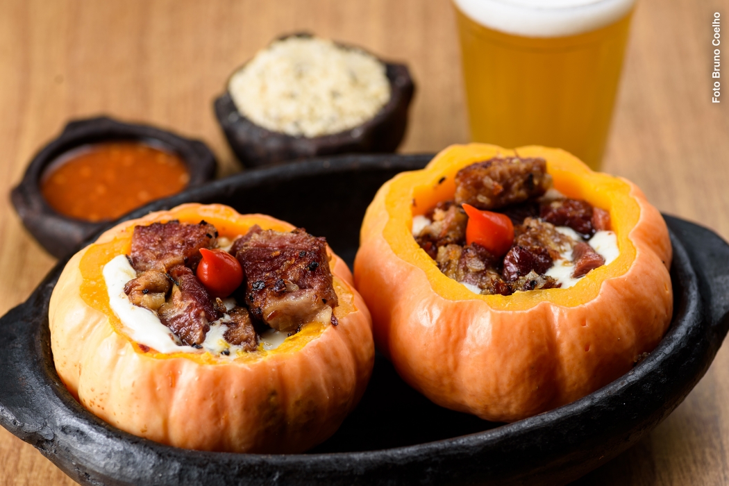 Petisco: Jabá Baby: releitura da clássica carne seca com abóbora, feita com abóbora baby e carne seca ao molho do chef.>