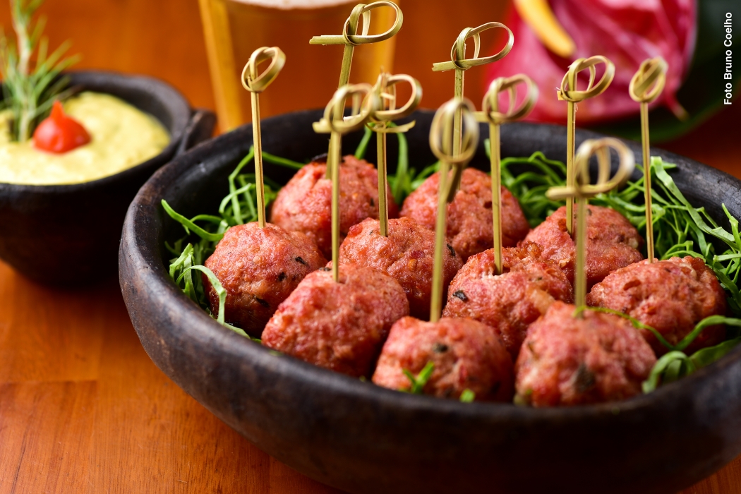 Petisco: Soltando o verbo: oito bolinhos de língua de boi ao vinho branco, páprica e pimentas clássicas.>