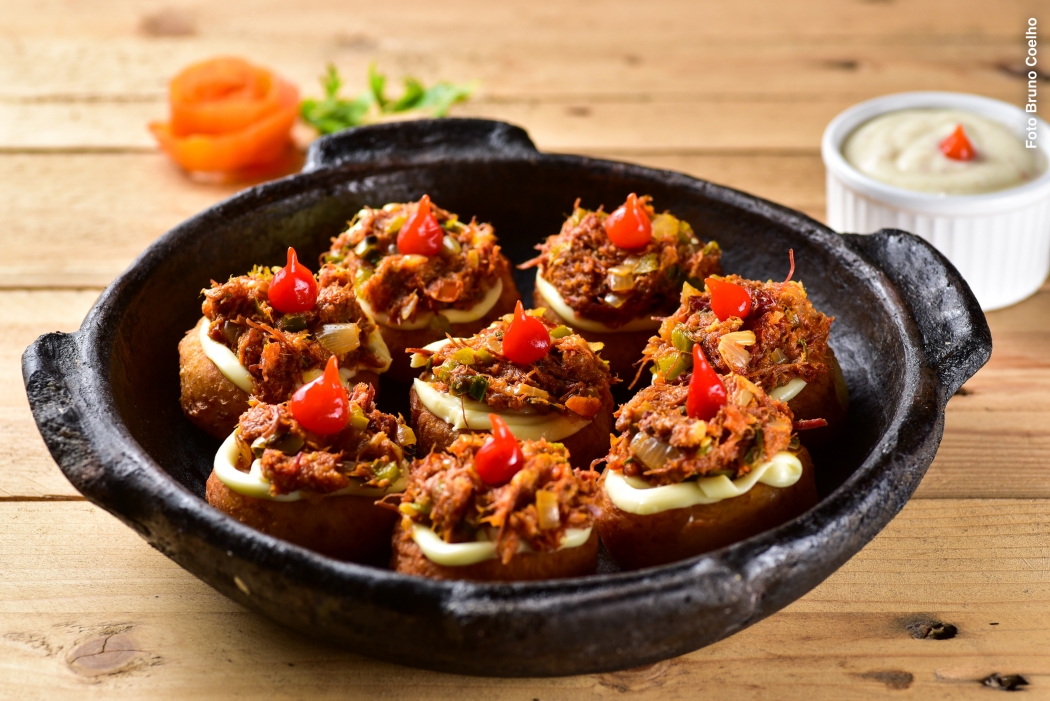 Petisco: Tuquinha: oito bolinhos de aipim com queijo, cobertura de ragu de carne seca, requeijão cremoso e pimenta biquinho.>