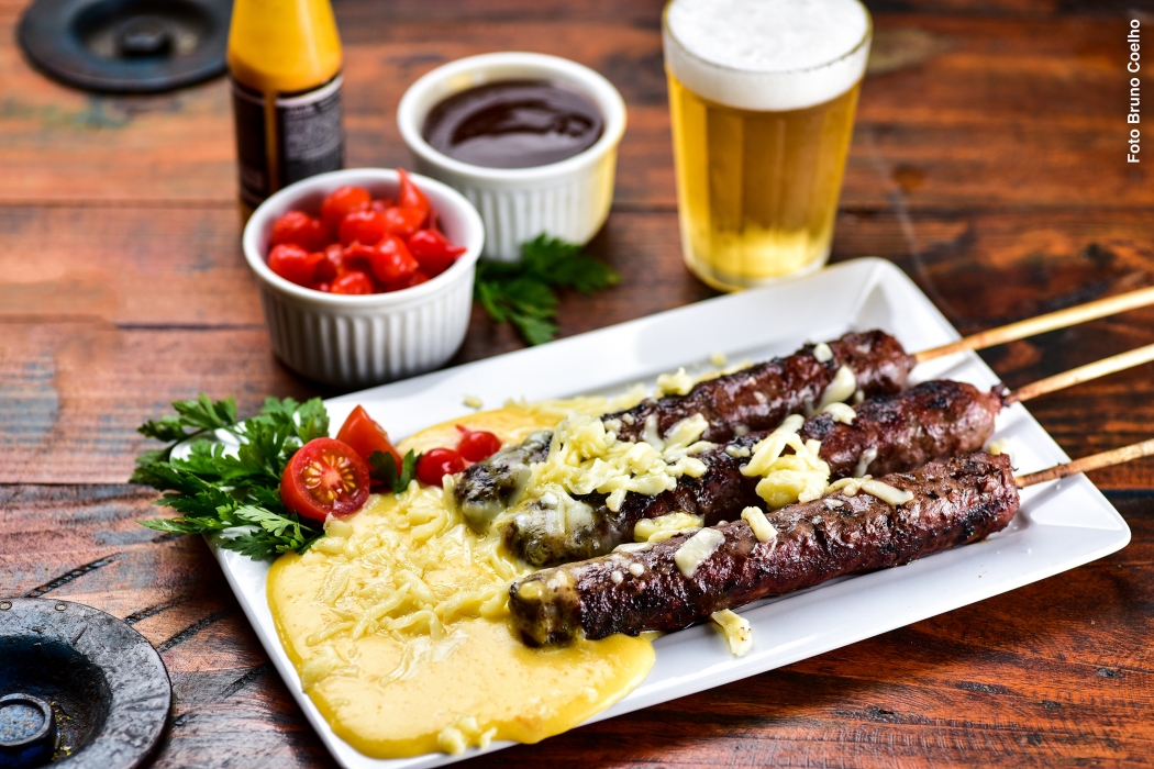 Petisco: Espírito Santo: espeto de moqueca de cação com cebola pérola, pimentão vermelho e amarelo. Acompanha farofa de banana, bolinho de siri e molho de coentro.>