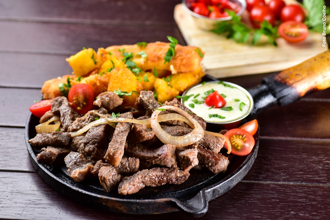 Petisco: Picanha mineirinha: tiras de picanha temperada ao alho com cebola, coberta com três tipos de queijo, acompanhadas de provolone empanado e polenta empanada).>