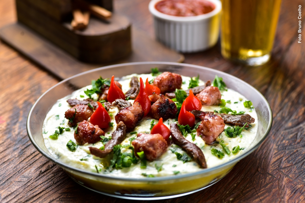 Petisco: Atolada: linguiça de pernil caseira com carne de sol flambada na cachaça, cobertura de polenta com molho requeijão.>
