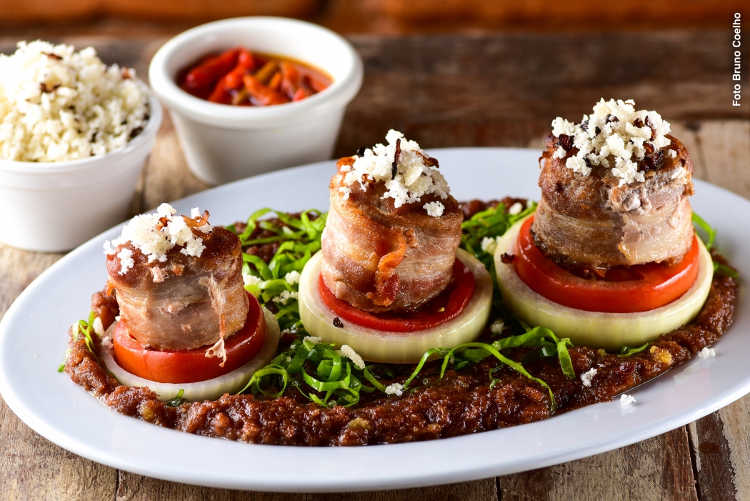 Petisco: Nem que a vaca tussa: alcatra de boi com creme de queijo e bacon picadinho.>