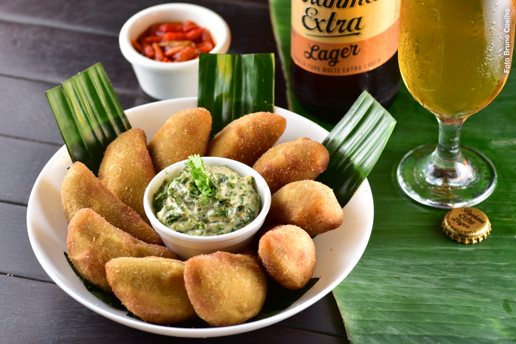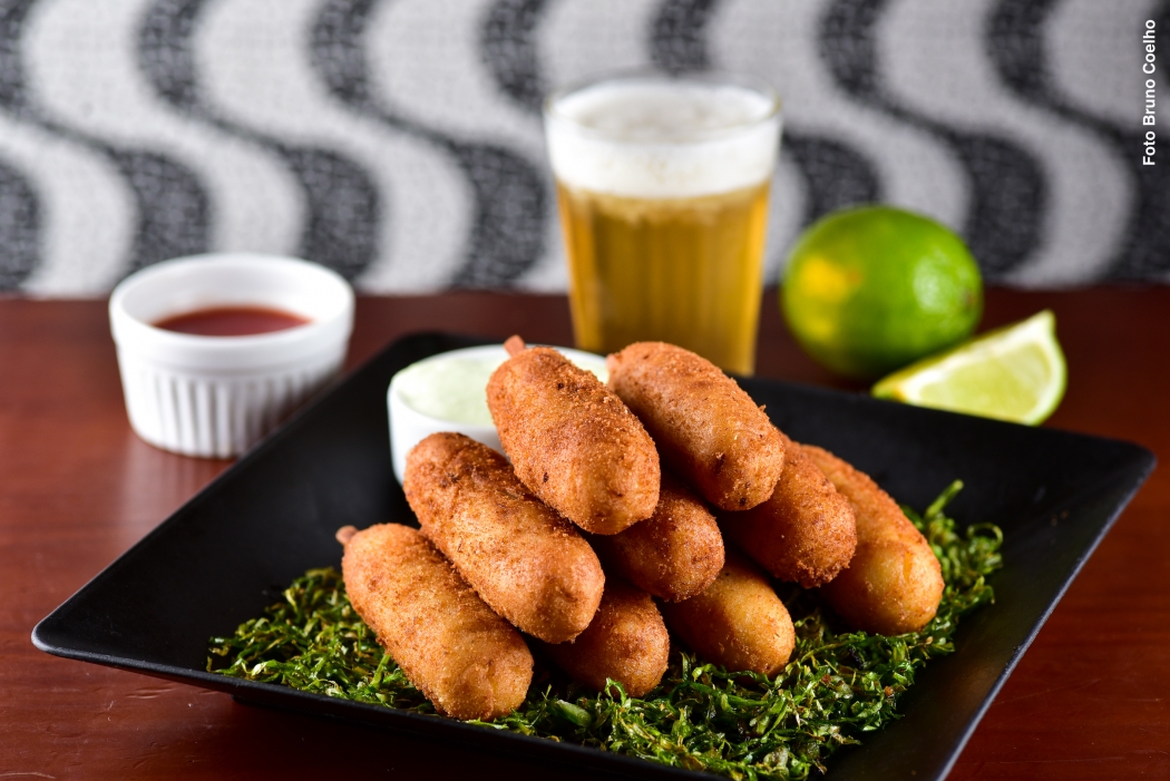 Petisco: Rei da Praia: risoles de banana da terra com recheio de peroá e maionese de coentro.>