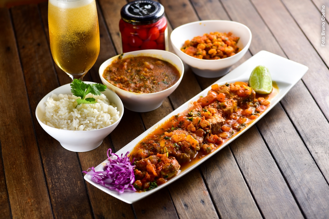 Petisco: Tô em dúvida: moquequinha de aratu (espécie de caranguejo) servida com rodelas de pão e farofa crocante e bolinho de carne feito com fraldinha e bacon moído.>