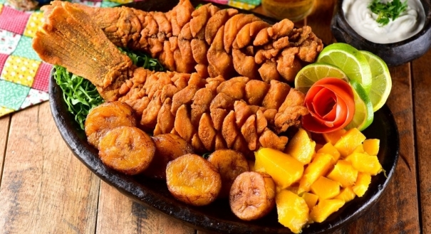 Petisco: Maria Tilápia: dois filés inteiros de tilápia empanados em farinha especial, acompanhados de banana da terra, tomate, alface, limão e molho especial.>