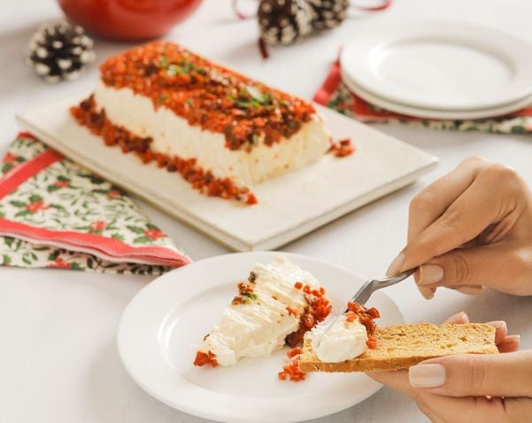 Disponha o creme de queijos na forma e aperte bem. Tampe com filme plástico e leve para gelar por aproximadamente duas horas. Desenforme, polvilhe as ervas por cima e sirva acompanhada de torradinhas.>