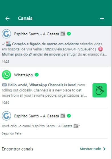 O WhatsApp, plataforma de mensagens instantâneas da Meta, que também é dona do Facebook e do Instagram, lançou nesta quarta-feira (13) um novo recurso chamado Canais. Com a ferramenta, o usuário vai poder buscar os perfis preferidos para seguir, a exemplo do que é feito em outras plataformas, como o Telegram. A Gazeta saiu na frente e já tem Canais no ar: um de notícias e um exclusivo sobre empregos. Saiba, abaixo, como acessá-los. >