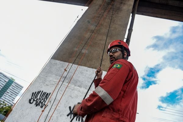 Vanildo Nascimento, supervisor responsável pela operação "radical", explica a dinâmica da ação. "Hoje, trabalhamos com dois profissionais com prática em alvenaria para fazer a manutenção de três pórticos. Essa técnica exige organização. Montamos o material de trabalho 24 horas antes, para que a Terceira Ponte não precisasse ser fechada. Subimos por baixo, pelo lado de Vitória, como se estivéssemos fazendo rapel mesmo", explica, dizendo que trabalha com alpinismo industrial desde 2010, fazendo manutenções em vários estados. >