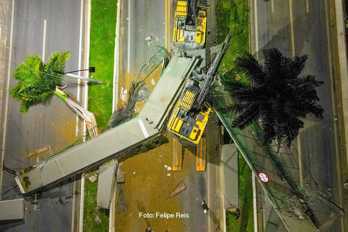 Imagens aéreas feitas pelo fotógrafo Felipe Reis dão uma dimensão de como ficou a BR 101 após a passarela desabar depois que a alça de uma retroescavadeira transportada por uma carreta bateu e levou a estrutura ao chão.>