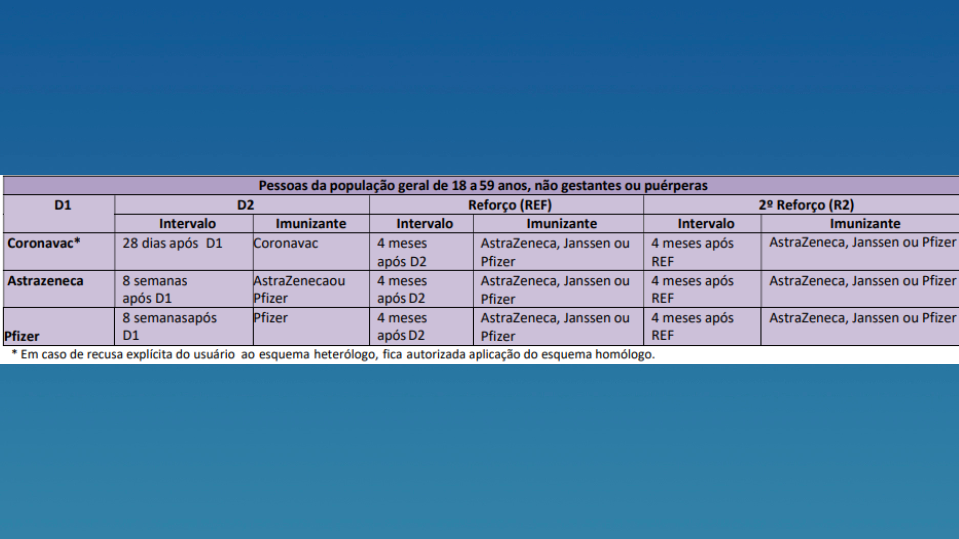 A vacina a ser utilizada deverá ser, preferencialmente, da plataforma de vetor viral (AstraZeneca ou Janssen), independente do imunizante aplicado anteriormente, exceto gestantes ou puérperas. Nesta condição, deve-se utilizar o imunizante Pfizer, e caso não estiver disponível, poderá ser utilizada a vacina Coronavac como dose de reforço.>