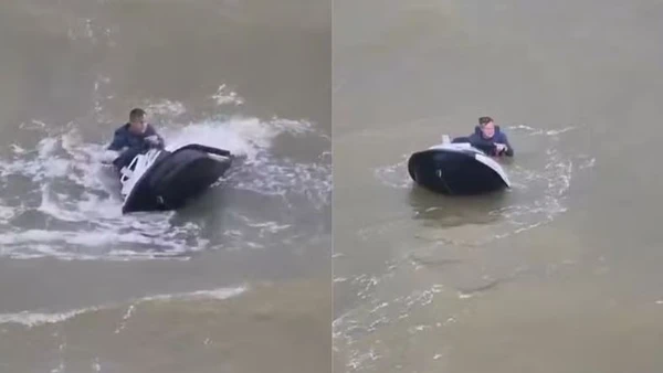 O empresário ficou aproximadamente 10 minutos tentando resgatar o amigo que não tinha forças para driblar as ondas e subir no veículo náutico. Depois de uma tentativa frustrada, em que o homem subiu na moto aquática, mas caiu novamente, André conseguiu segurá-lo pelo colete.>