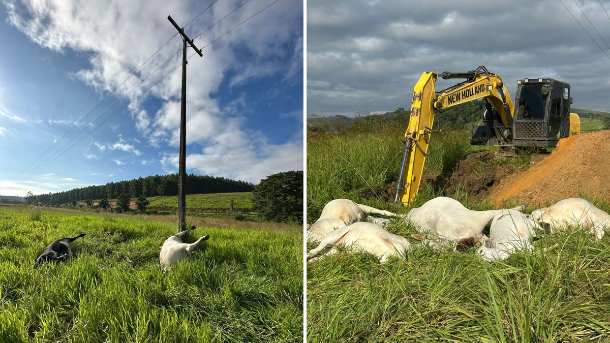 Onze vacas prenhes de sete meses e quatro bezerros morreram após serem atingidos por um fio de alta tensão que se rompeu na tarde de sábado (31), na Fazenda Tupã, na zona rural do bairro Bebedouro, em Linhares, no Norte do Espírito Santo. O dono da propriedade, Adão Cellia, de 67 anos, estima um prejuízo superior a R$ 80 mil e responsabiliza a concessionária de energia que atende a região, citando constantes "remendos" na rede elétrica e frequentes quedas de energia que, segundo ele, colocam à prova a paciência dos moradores.>