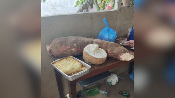 De acordo com o morador Edmilson Caldeira Dias, de 40 anos, ele plantou a mandioca no quintal de casa no início de 2023 e, nos últimos dias, um conhecido disse que havia uns galhos do tubérculo perto da cerca.>