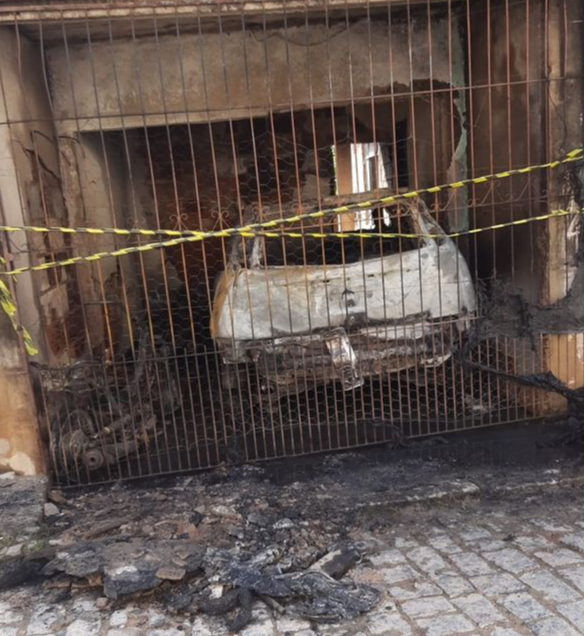 Quando os bombeiros chegaram, o fogo já tinha atingido vários cômodos da casa e estava se alastrando para a garagem. Como havia uma moto e um veículo cheio de combustível, a equipe atuou imediatamente e depois acabou com os focos no interior da residência. Esses veículos não eram do dono da casa, mas sim de vizinhos que alugavam a garagem. Tudo ficou completamente queimado.>