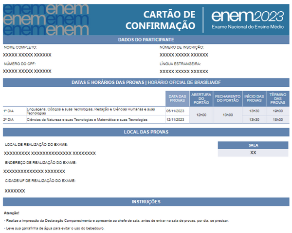 Os portões abrem ao meio-dia e fecham às 13h, no horário de Brasília, mas mas a orientação do Inep é chegar às 12h ao local do exame. Por isso, é importante conferir corretamente o local da prova o quanto antes e se programar, calculando o tempo de deslocamento até lá.>