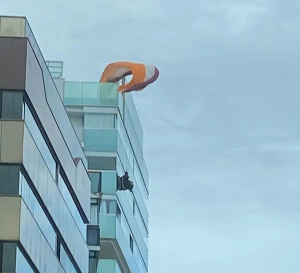 Segundo o Corpo de Bombeiros Militar, o homem perdeu o controle do parapente na descida, ficando preso no alto do edifício. >