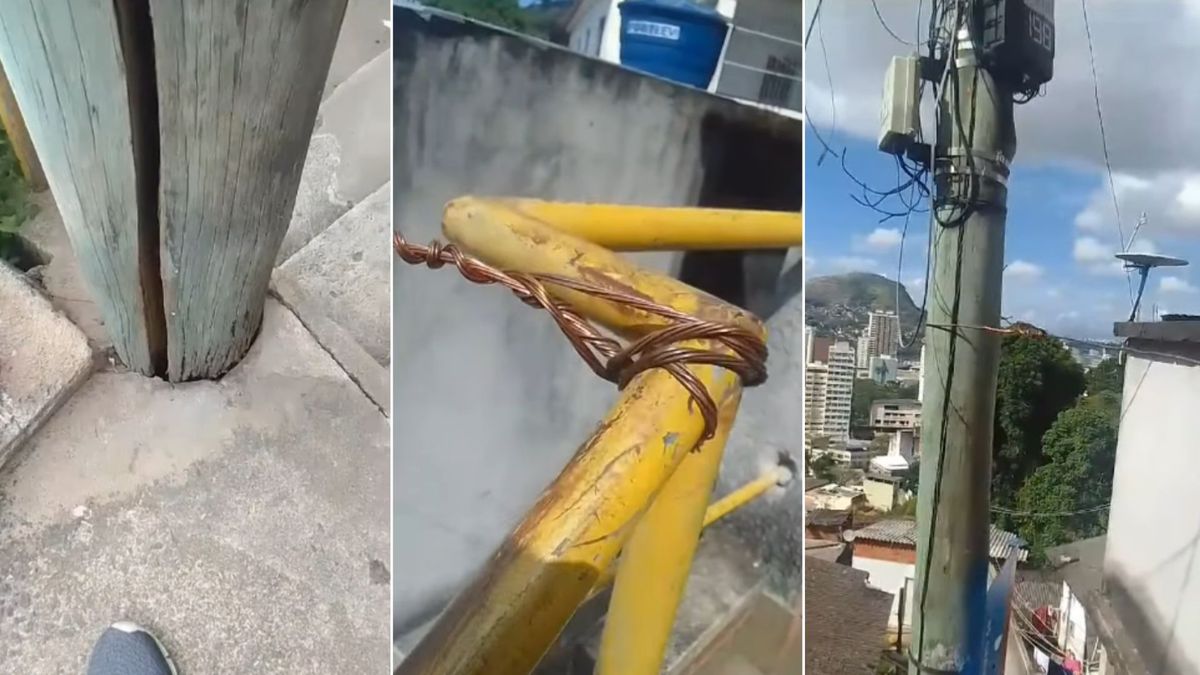 Moradores do Morro da Piedade, em Vitória, temem que dois postes localizados na escadaria Áurea Gonçalves caiam e coloquem em risco a vida de quem passa pelo local. Em vídeo enviado à reportagem de A Gazeta, é possível ver um dos postes amarrado por um fio de cobre e outro com a estrutura de madeira deteriorada. (veja acima)>