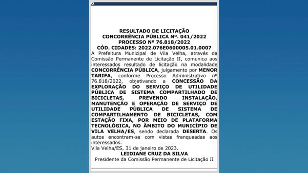 Previsto para voltar a funcionar até o final deste semestre, o sistema de bicicletas compartilhadas de Vila Velha, o Bike VV, ainda depende de empresas interessadas na concessão do serviço. Em uma publicação no Diário Oficial desta quarta-feira (01), a licitação foi dada como "deserta" – ou seja, não houve procura pelo empreendimento. >