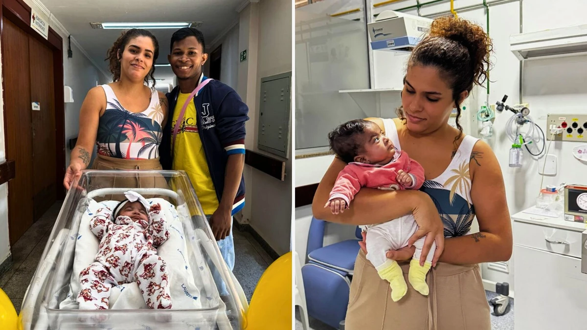 “Ela é nosso pequeno milagre. Tive complicações na gestação das gêmeas e identificaram a necessidade da cesárea para não perdermos as duas crianças e conseguir salvar a vida de, pelo menos, uma delas. A Jade era o bebê menor e achávamos que a perderíamos. Tivemos medo de ela não resistir também, porque passou por diversos procedimentos, cirurgia no coração e tratamos os olhinhos. Sair de alta é uma emoção sem fim”, relatou a mãe.>