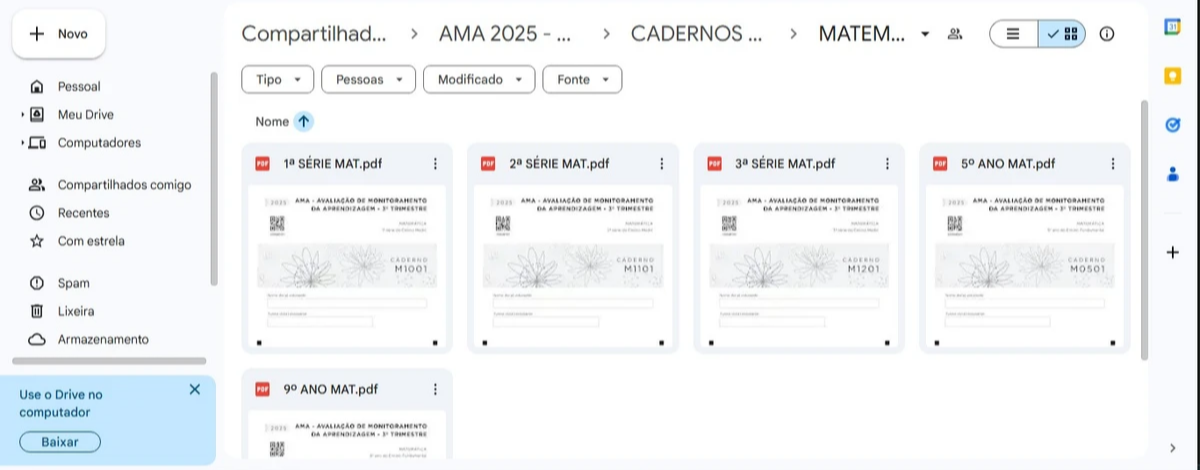 O material estava sendo compartilhado em uma pasta virtual, no Google Drive, criada para lançar informações sobre diretrizes da avaliação, matriz de referência, entre outras instruções. E lá estão também os cadernos de provas da AMA — uma estratégia da secretaria para acompanhar o desenvolvimento das habilidades dos alunos nas duas disciplinas. A pasta estava circulando livremente em aplicativo de mensagem nas últimas semanas e, mais recentemente, foi atualizada com as provas. >