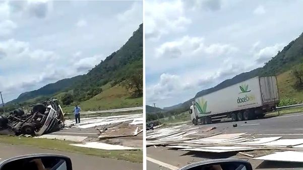 O tombamento de uma carreta interdita pistas da BR 101 Sul, no sentido Guarapari, no final da manhã deste domingo (13). Segundo imagens de um internauta, a carga ficou espalhada pela pista. Ainda não há informações sobre vítimas. >