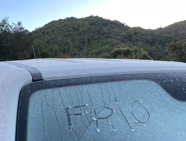 O registro mostra camada de gelo sobre as barracas de camping, na grama e até sobre os carros próximos ao acampamento da Macieira. “Esses registros eu fiz durante a madrugada e hoje (23) cedo. Sou trilheiro, mas nunca passei tanto frio assim. Chegou a 5 graus negativos lá no pico e no acampamento. Já estou em Pedra Menina, Dores do Rio Preto, e hoje de manhã choveu por aqui”, contou Hoffman, que é do distrito de Laginha, em Pancas.>